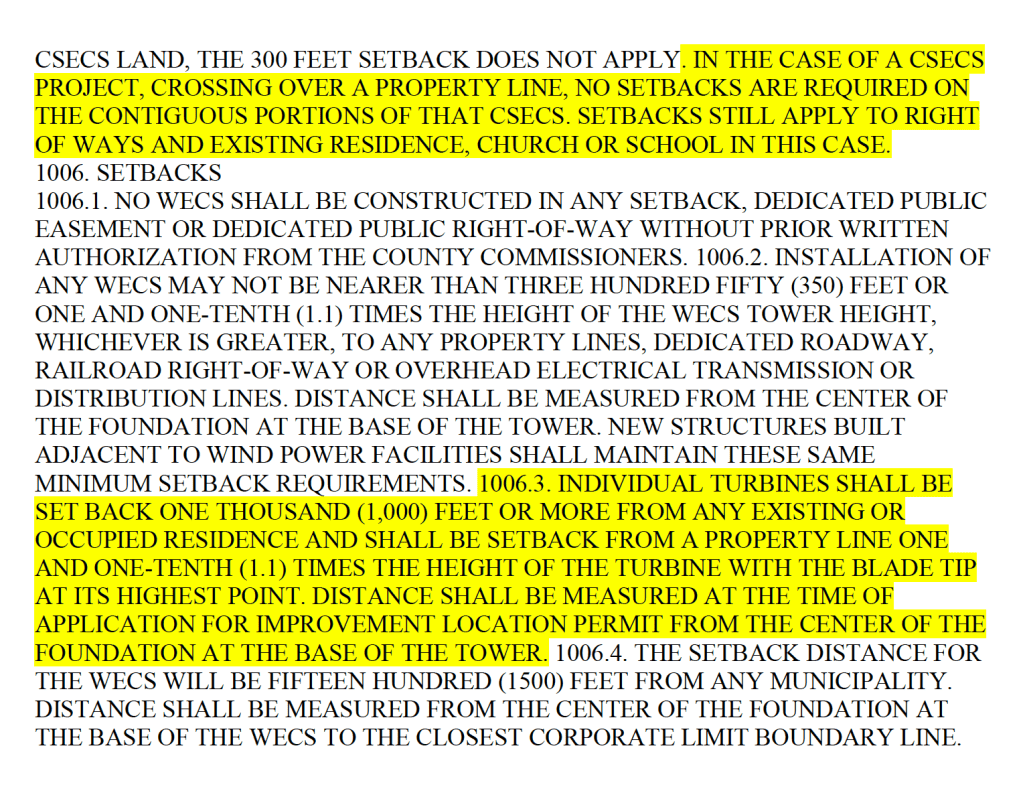 The first highlighted section below shows how the Solar part of the ordinance reads. The second highlighted part shows the Wind part of the ordinance.